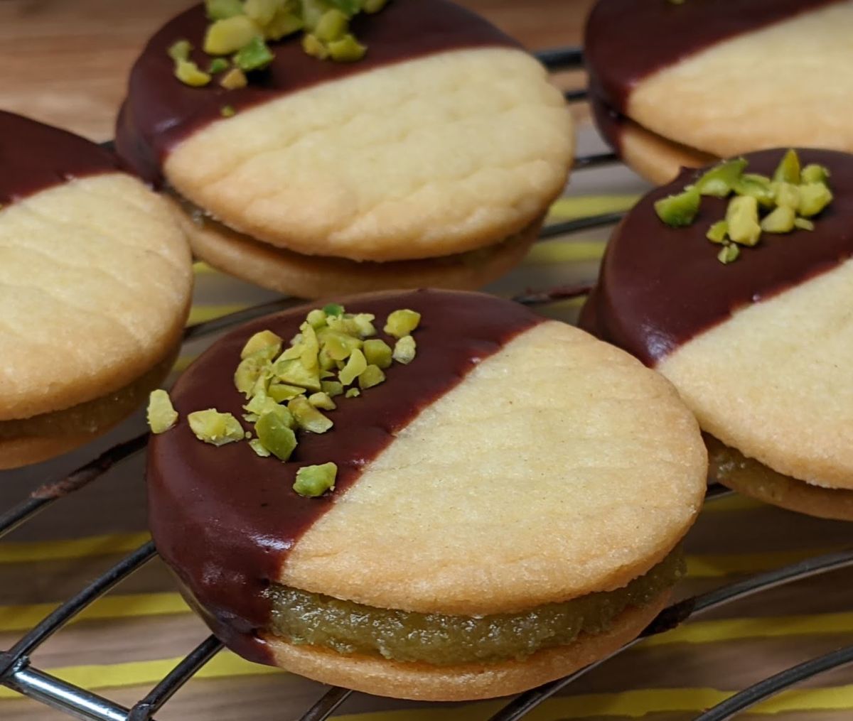 Schokolade im Wasserbad schmelzen, Kekse zur Hälfte eintunken und mit den gehackten Pistazien bestreuen.