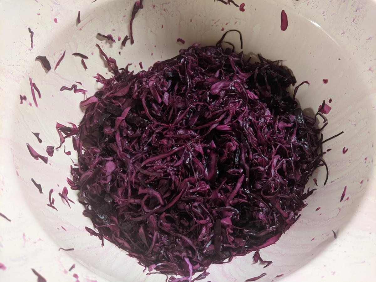 Rotkraut fein hobeln. Salz, Zucker und Essig dazugeben und mit den Händen kräftig durchkneten.